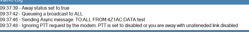 Hey Tom. When you send a broadcast in unattended link disabled and your AWAY say to "I'm away" - you get this message on the log (see last line)